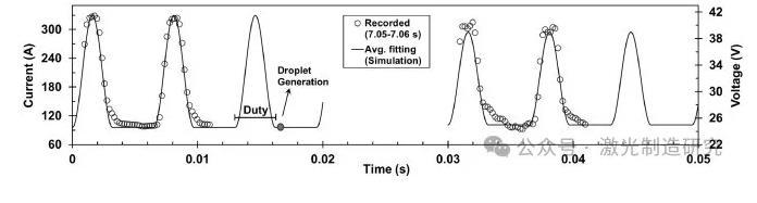 其中,I 1、I 2和P d分別是背景電流、脈沖電流和總波形的脈沖占空比,模擬電流和電壓的相關波形如圖7所示。記錄的每個電極的平均功率為4957 J/s,與模擬的平均功率4740 J/s相比,證實了該模型在5%誤差內的準確性。在整個模擬時間內,一旦脈沖在每個周期結束,液滴產生時間就與波形同步。