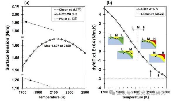 圖6表面張力(a)及其梯度(b)是溫度和硫重量%的函數。關于中間范圍(M)的轉變溫度,高溫和低溫分別用字母H和L標記