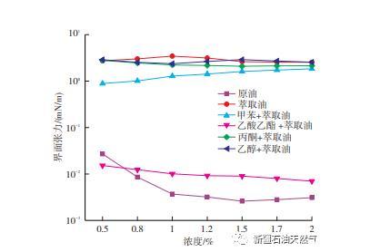 圖4為原油、萃取油以及萃取油分別添加濃度為1%的甲苯洗脫物、乙酸乙酯洗脫物、丙酮洗脫物、乙醇洗脫物配成的模擬油與0.5%,0.8%,1%,1.2%,1.5%,1.7%,2%這七種濃度Na2CO3的界面張力。可以看出,乙酸乙酯洗脫組分與堿的界面張力最低。隨著Na2CO3濃度變大,界面張力也持續降低,當Na2CO3濃度達到2%時,其界面張力達到10-3 mN/m。孫景倫等研究了復合驅油體系中堿與原油的相互作用,發現Na2CO3更易于環烷酸以及苯環和不飽和酸部分反應;與飽和酸相比,環烷酸以及苯環和不飽和酸的界面活性更強,導致界面張力更低。