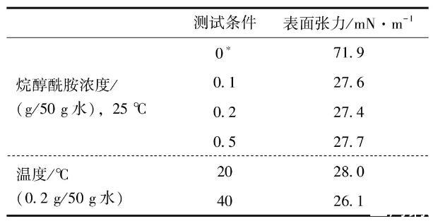 某學(xué)生自制烷醇酰胺不同測試下表面張力測試值,如表1所示。合成的烷醇酰胺具有較強(qiáng)的表面活性。25℃下純水表面張力為71.9℃mN/m。當(dāng)50 g水中加入0.1 g烷醇酰胺時,其表面張力顯著降低,為27.6 mN/m。當(dāng)增至0.2 g時達(dá)到最低值(27.4 mN/m),繼續(xù)增加,反而略有增加。上述結(jié)果表明,0.2 g烷醇酰胺加入量已達(dá)到其CMC濃度。同樣,在最佳濃度下(0.2 g/50 g水),隨著測試溫度的升高,烷醇酰胺水溶液表面張力降低。