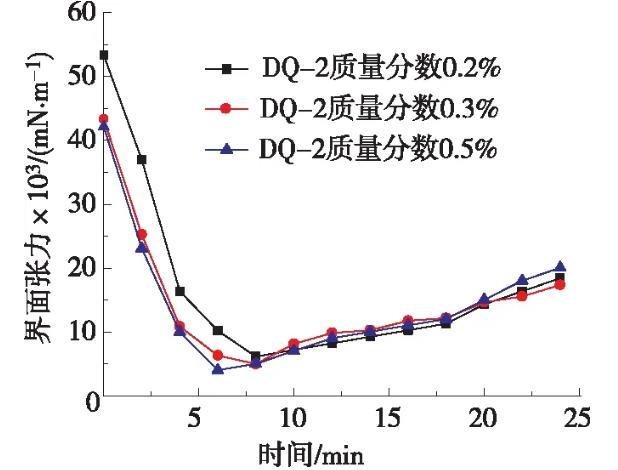 將一定質量濃度的十二烷基硫酸鈉、椰子油脂肪酸二乙醇酰胺和十二烷基二甲基甜菜堿和適量的水置于三口燒瓶,并在60℃條件下進行攪拌至3種表面活性劑完全溶解,加入質量分數為5%的乙醇,攪拌30 min后制得低界面張力表面活性劑DQ-2。