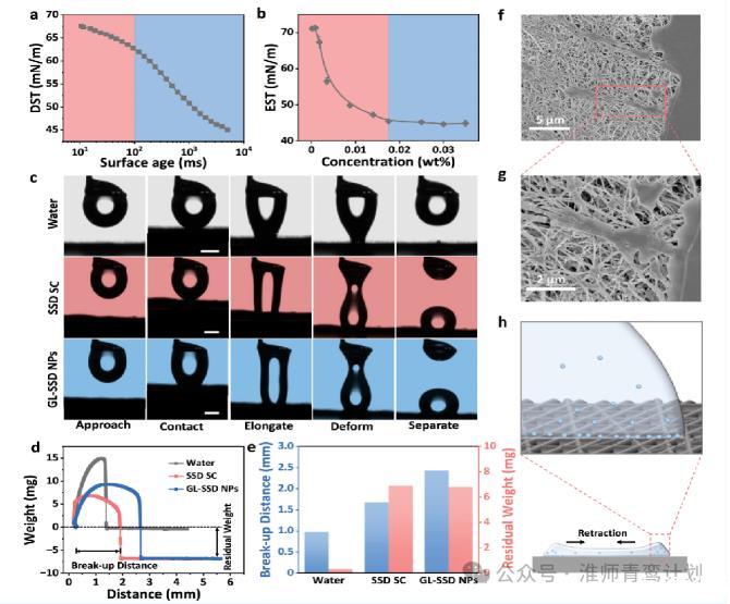 然后,作者研究了GL-SSD NPs液滴在疏水表面的沉積機(jī)理。先是測量了GL-SSD NPs溶液的動態(tài)表面張力(DST)和粘度。DST結(jié)果顯示,GL-SSD NPs溶液在前100 ms內(nèi)發(fā)生輕微變化,這意味著GL-SSD NPs的擴(kuò)散速率較慢,EST值隨著濃度從0到0.018 wt%的增加而減小到45 mN m?1,而當(dāng)濃度高于0.018 wt%時,EST值保持不變。因此,0.018 wt%作為GL-SSD NPs的臨界膠束濃度(CMC)清楚地觀察到接近、接觸、伸長、變形和分離的順序過程。從PTFE表面分離后,水滴從表面被徹底清除,沒有留下任何殘留物,而SSD SC和GL-SSD NPs液滴在中間發(fā)生了明顯的伸長和斷裂,在表面保留了大量的液體。水、SSD SC和GL-SSD NPs的殘余質(zhì)量分別為0.35、6.9和6.8 mg,而GL-SSD NPs溶液的破裂距離為2.43 mm,遠(yuǎn)高于水和SSD SC的0.97 mm和1.68 mm,表明GLSSD NPs與PTFE表面的相互作用最強(qiáng)。此外,掃描電鏡(SEM)圖像顯示,撞擊后的縮回軌跡中留下了大量的液滴殘留物。在液滴撞擊過程中,大量GL-SSD NPs在三線處的沉積會利用PTFE表面固有的親水性改變其潤濕性,產(chǎn)生固定點,延緩液滴縮回。