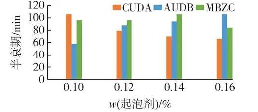 3種起泡劑在不同用量下的半衰期測試結(jié)果如圖1所示。