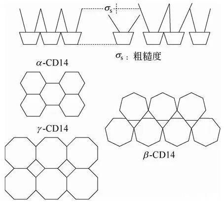 為了考察環糊精種類對所制備LB膜結構的影響,Schalchli等用X-Ray反射技術對3種兩親性環糊精(α-、β-、γ-)在硅片上形成的LB單分子膜結構進行了研究。結果顯示,所有兩親性環糊精都在基底上形成了單分子層,但兩親性α-和γ-環糊精LB膜的結構相似,而β-環糊精LB膜的結構與前兩者有很大的不同。并且兩親性β-環糊精LB膜的粗糙度也遠遠大于兩親性α-和γ-環糊精。以上不同的原因緣于β-環糊精的七邊形環不同于α-,γ-環糊精的六或八邊形環是對稱結構,從而不能像α-,γ-環糊精那樣在基底上形成有序的結構,如圖1所示。類似地,Alexandre等用掃描力顯微鏡(scanning force microscopy)考察了兩親性α-,β-,γ-全疊氮基環糊精在云母片上的LB膜的結構。無論在納米尺度還是在微米尺度下觀察,β-全疊氮基環糊精勻呈現出不同的形貌。