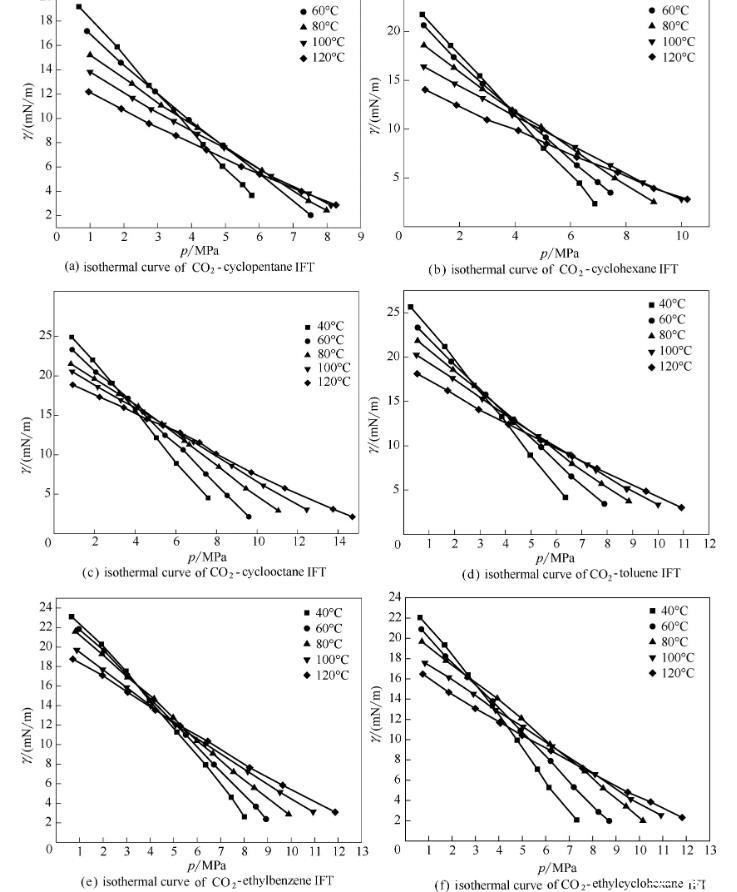本文采用懸滴法測定了CO2-環戊烷/環己烷/環辛烷/甲苯/乙苯/乙基環己烷的界面張力,測量范圍為40~120℃,0.27~14.70 MPa。探討了壓力、溫度、碳原子數以及分子結構對界面張力的影響并提出了計算CO2-原油組分界面張力的經驗方程。得出以下結論。