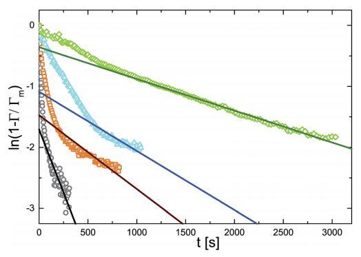 圖 6 ln(1 - r/rm) 作為不同體積濃度的時間函數 微凝膠顆粒:(>)0.10 g l-1 , (D)0.20 克 l-1 , (,)0.50 克 l- 1 , (乙) 1.00 克 l- 1 . 實線是直線擬合。