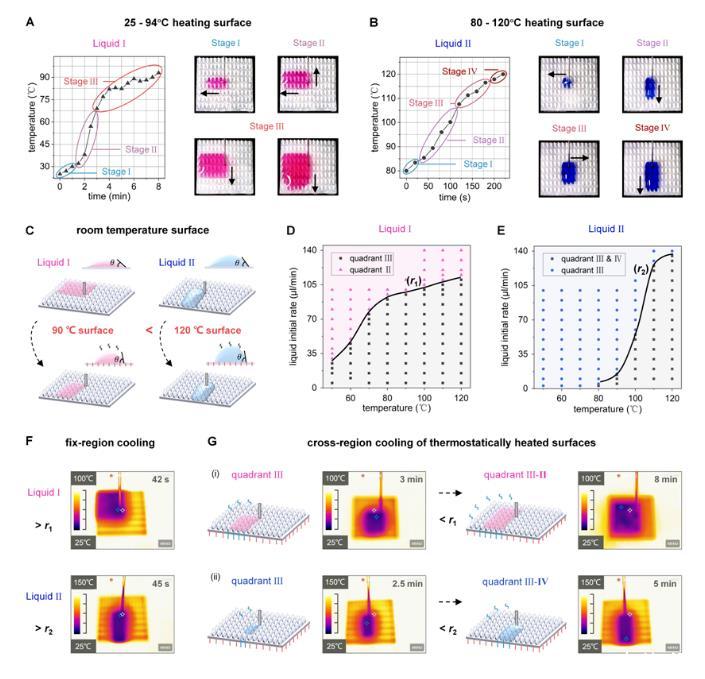 在熱交換應(yīng)用中,溫度導(dǎo)致的液體性質(zhì)變化是一個廣泛存在的現(xiàn)象,給傳統(tǒng)的液體操縱表面在高溫環(huán)境下的應(yīng)用帶來了挑戰(zhàn)。本研究提出的結(jié)構(gòu)化表面能在高溫環(huán)境下有效維持對液體的定向運(yùn)輸。并在高溫導(dǎo)致的液體表面張力變化下,完成了在持續(xù)變溫表面上對液體運(yùn)輸方向的智能調(diào)控,和在恒溫加熱表面上時空可控的靶向冷卻(圖4)。這種基于溫度調(diào)控液體性質(zhì)的智能液體運(yùn)輸能力,為按需熱管理提供了新的解決方案。