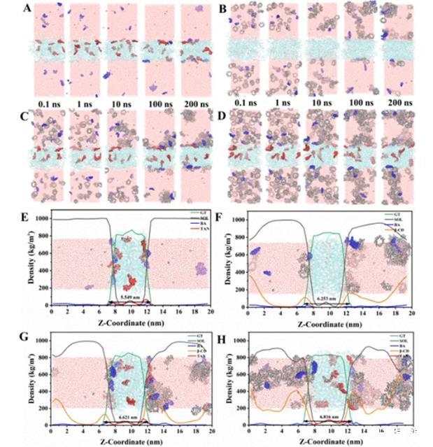 界面層厚度受分子種類、結構及密度影響顯著。實驗表明,實驗組尤其是實驗2中油相增厚,可能是由于TAN在油水界面與膽鹽和β-CD發(fā)生相互作用。該現(xiàn)象說明β-CD與TAN之間的相互作用不僅促進了TAN向界面遷移,還揭示了BS或β-CD對TAN的吸附能力。實驗組界面β-CD密度提升,說明β-CD與TAN相互吸引。動力學模擬結果表明β-CD先與TAN結合于界面,誘導膽鹽圍繞此復合物聚集,系統(tǒng)能量漸趨穩(wěn)定。最終,TAN主要錨定于由膽鹽與環(huán)糊精構筑的界面團聚體上,增強環(huán)糊精對膽鹽的親和力,導致環(huán)糊精與膽鹽組裝形成更大的聚集體,從而增加界面厚度。