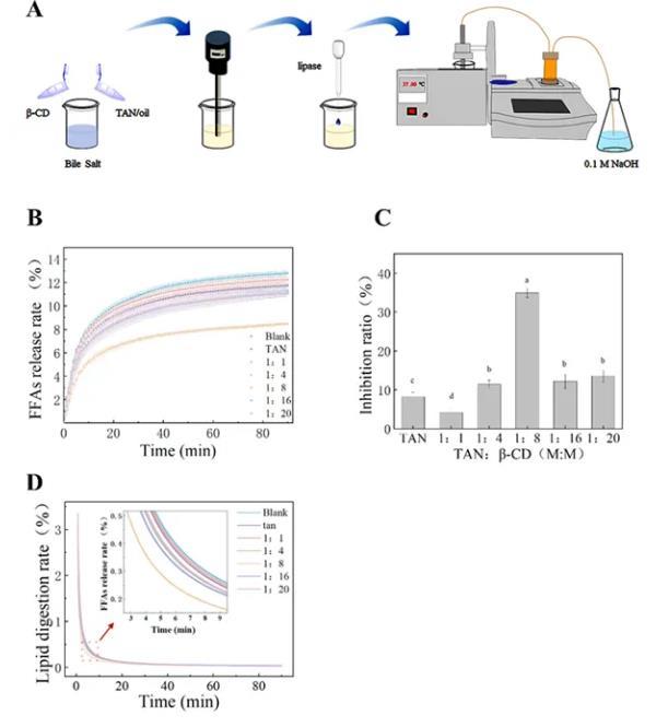 β-CD與TAN協(xié)同作用顯著減少NaOH消耗,抑制脂質消化。脂質消化程度受到抑制,抑制程度與β-CD添加量無關。當TAN與β-CD的摩爾比為1:8時,抑制脂質消化的效果最佳,抑制率為34.92%。這可能是因為兩者在界面上自組裝,增強了界面活性。β-CD與疏水物質形成的復合物可以通過氫鍵在油水界面上組裝形成致密網(wǎng)絡,顯著增強界面穩(wěn)定性,限制脂肪酶在界面區(qū)域的吸附,從而抑制脂質消化。在消化的后期階段,物質在液滴間的置換達到平衡,從而在界面處產(chǎn)生恒定和動態(tài)的可吸附區(qū)域。此時,消化速率變化不大,游離脂肪酸的釋放和解吸速率保持相對恒定。