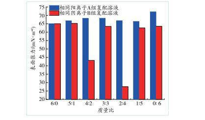 1)與純水相比,復配后的A、B 2組溶液的表面張力顯著降低,A組復配溶液的表面張力隨不同復配質量比變化不大,B組復配溶液的表面張力易受復配質量比變化的影響。