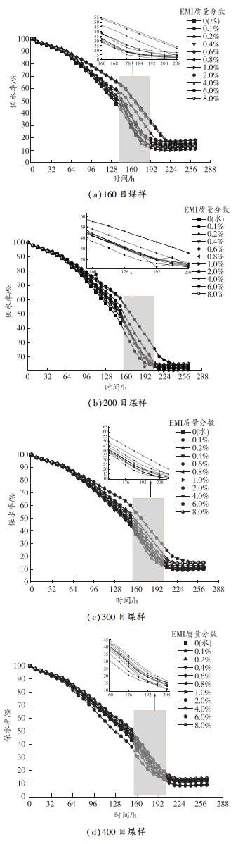 對(duì)比不同質(zhì)量分?jǐn)?shù)EMI溶液對(duì)不同粒徑煤樣保水率的影響曲線(見圖9)可以發(fā)現(xiàn),在160目測(cè)試煤樣中,煤樣在溶液中EMI質(zhì)量分?jǐn)?shù)為1.0%時(shí)靜置,出現(xiàn)了析水現(xiàn)象。相比于160目測(cè)試煤樣,200目和300目測(cè)試煤樣分別在EMI質(zhì)量分?jǐn)?shù)為2.0%、6.0%的溶液中靜置,出現(xiàn)了析水現(xiàn)象。160、200、300目3組測(cè)試煤樣,在EMI質(zhì)量分?jǐn)?shù)小于6.0%的溶液的保水率在216 h后趨于穩(wěn)定,400目測(cè)試煤樣在208 h后趨于穩(wěn)定;而在EMI質(zhì)量分?jǐn)?shù)為6.0%與8.0%溶液中,160、200、300、400目測(cè)試煤樣分別在240、248、232、216 h后保水率趨于穩(wěn)定,穩(wěn)定時(shí)間均大幅提高。說(shuō)明溶液中EMI質(zhì)量分?jǐn)?shù)越高,煤塵的保水效果越好。