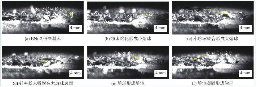 圖3是激光釬涂過程中的超高速攝影照片(4000幅/s),直觀地表征了激光釬涂過程中釬料粉末在激光作用下熔化、鋪展、凝固的過程。從圖3中可看出,在激光釬涂過程中,釬料呈現(xiàn)4種狀態(tài),分別為粉末態(tài)、熔球態(tài)、熔池態(tài)、凝固態(tài)。在激光未掃描的位置,釬料保持原始的粉末狀態(tài),如圖3a所示。被激光束掃到的位置,粉末態(tài)的釬料吸收能量,升溫熔化,形成尺寸較小的液態(tài)熔球,如圖3b所示。隨后,粉末釬料的不斷熔化形成更多液態(tài)小熔球,尺寸較小的熔球互相結(jié)合匯聚成尺寸較大的液態(tài)熔球,如圖3c所示。同時可觀察到未熔化的釬料粉末在液/固界面張力作用下,逐漸被吸附到尺寸較大的熔球表面,如圖3d所示。隨著激光逐漸向前掃描,熔球不斷長大,當熔球固相表面張力與重力的合力作用大于液/固界面張力后,大尺寸熔球在基體鋪展?jié)櫇瘢纬扇鄢兀鐖D3e所示。最后,隨著激光熱源的移動,激光后端的熔池溫度逐漸降低,液態(tài)釬料逐漸凝固,在基體表面形成涂層,如圖3f所示。