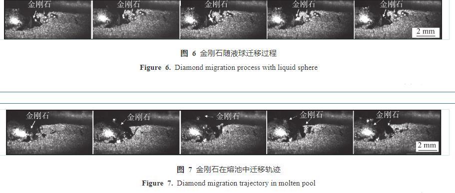 圖8為金剛石置于釬料底部時,金剛石在激光釬涂過程中運動軌跡。可見,無論金剛石是直接鋪置于釬料表面,還是置于釬料底部,在釬涂過程中,金剛石均會上浮到涂層表層。具體過程為在激光熱源作用下,表層的釬料開始熔化成液態(tài)小球,由于金剛石的高透光性和高熔點,金剛石不會熔化。在液態(tài)小球聚集長大的過程中,金剛石沿著液球邊緣運動,當液態(tài)小球匯入大熔球時,金剛石繼續(xù)沿著大熔球的邊緣向表面運動,最后凝固于釬料涂層表層。