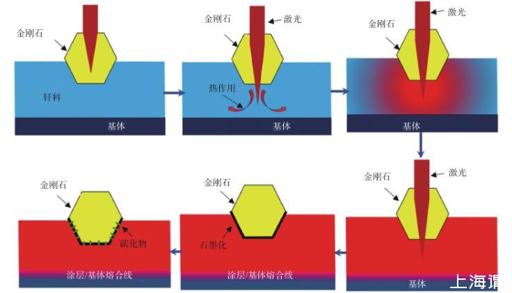 試驗所用激光波長為1.075μm,因此在激光釬涂過程中,激光會透射金剛石而直接加熱釬料,釬料吸收激光能量而迅速升溫、熔化,形成熔池。熔池熱量向金剛石傳導,潤濕金剛石,并誘導與熔池接觸的金剛石表面部分石墨化,與熔池中的Cr等元素發(fā)生反應(yīng),形成鉻的碳化物,增強了金剛石與釬料之間的冶金結(jié)合強度。釬料直接受熱升溫,金剛石被釬料熱傳導后吸熱升溫。金剛石透射激光的高效低損傷熱作用特性會有效避免金剛石在釬涂過程中的過熱損傷,這是激光釬涂金剛石涂層的最大潛在優(yōu)勢之所在,金剛石透射激光的熱作用如圖13所示。