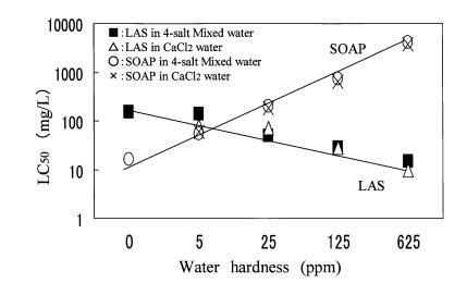 圖 4 水硬度對急性毒性的影響 LAS 和 SOAP 到 4-鹽混合中的 Orysis Latipes 水。