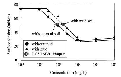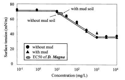 圖 11 泥土存在對地表的影響 LAS 和有毒表面張力的張力曲線 Daphnia Magna 的價值。