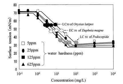 圖 10 水硬度對表面張力的影響 AE 和有毒表面張力值的曲線 水蚤麥格納。
