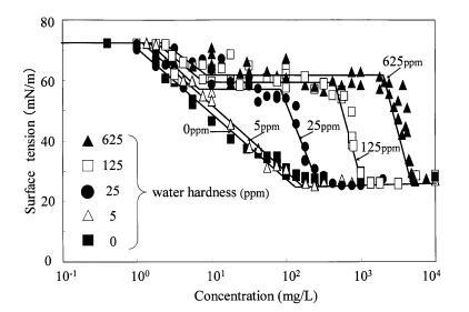 圖 6 水硬度對表面張力的影響 LAS 和有毒表面張力值的曲線 3 水生物種。