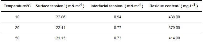 在水力壓裂過程中,僅壓裂返排液的粘度低不能說明裂縫中的壓裂液已返排干凈,要綜合考慮其破膠性能。壓裂液在10、20和50℃條件下破膠3 h后,破膠液的表面張力、界面張力和殘渣量的測定結(jié)果如表3所示。由表中數(shù)據(jù)可知,無論是在10、20還是50℃條件下,破膠液的表面張力均小于28 mN/m,界面張力均小于2 mN/m,殘渣量均小于600 mg/L,達(dá)到或優(yōu)于我國石油天然氣行業(yè)標(biāo)準(zhǔn)SY/T 6376-2008《壓裂液通用技術(shù)條件》的要求,SY/T 6376-2008中關(guān)于破膠性能的各項指標(biāo)分別為:破膠時間≤720 min,破膠液表觀粘度≤5.0 mPa·s,破膠液表面張力≤28.0 mN/m,破膠液與煤油界面張力≤2.0 mN/m,殘渣量≤600 mg/L。這充分說明ME-O5在低溫下的破膠效果良好,在低溫油田壓裂破膠方面表現(xiàn)出巨大的應(yīng)用潛力。