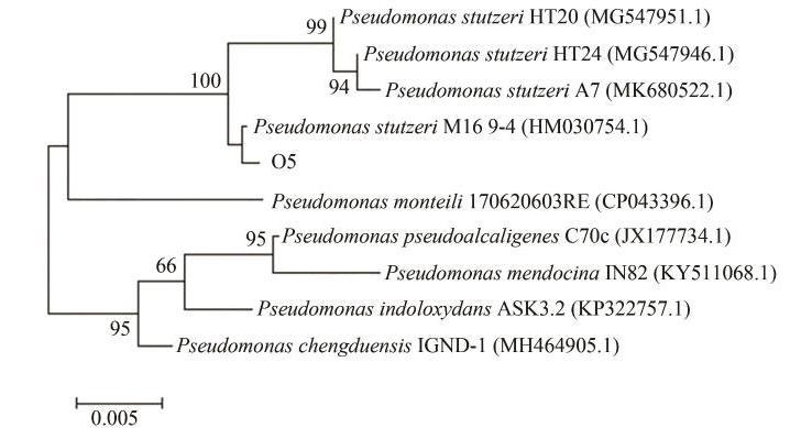 利用16S rRNA基因測序?qū)闛5進(jìn)行鑒定,將測序結(jié)果通過NCBI數(shù)據(jù)庫中的BLAST進(jìn)行比對分析,發(fā)現(xiàn)菌株O5與假單胞菌的同源性最高,為99.87%。利用MEGA軟件構(gòu)建系統(tǒng)發(fā)育樹(圖4)。由圖4可知,菌株O5和施氏假單胞菌Pseudomonas stutzeri M16-9-4位于進(jìn)化樹的同一分支中,親緣關(guān)系最相近。綜合形態(tài)特征鑒定,鑒定菌株O5為施氏假單胞菌(Pseudomonas stutzeri),命名為Pseudomonas stutzeri O5。