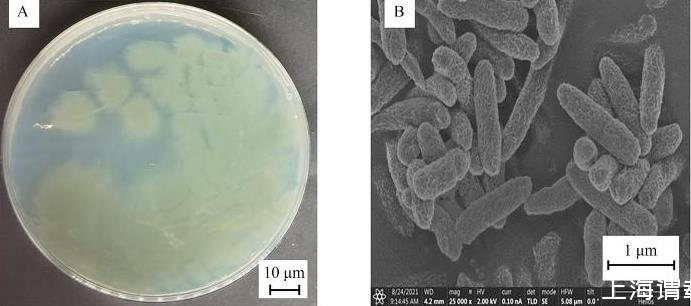 形態(tài)學(xué)鑒定如圖3所示,菌株O5在LB平板上呈灰綠色,表面光滑隆起,邊緣不整齊;革蘭氏染色鑒定為陰性;經(jīng)掃描電子顯微鏡觀察得,菌株O5為桿狀菌,菌體長為1.5~2.0μm,寬為0.3~0.4μm。