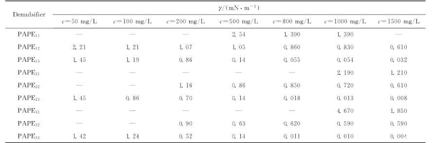 PAPE11、PAPE12和PAPE13是相對分子質量相當、HLB值逐漸增大,亦即其親水性逐漸增強的3個破乳劑樣品。從表3還可以看出,在同樣的破乳劑濃度下,HLB值越大的破乳劑降低油-水界面張力的幅度越大,油-水界面張力越低,甚至發生數量級的變化;而要將油-水界面張力降低至同樣的水平,HLB值大的破乳劑所需要的濃度則更低,即其降低油-水界面張力的效率越高。PAPE21、PAPE22和PAPE23以及PAPE31、PAPE32和PAPE332個系列的破乳劑隨著HLB值的增大也表現出同樣的規律。PAPE12、PAPE22和PAPE32是保持HLB值相當、相對分子質量逐漸增大的3個破乳劑樣品,隨著相對分子質量的增大,它們降低油-水界面張力的能力均有所增強,但增強的幅度不大,大體均在同一數量級內變化。PAPE13、PAPE23和PAPE33是水溶性最好的一組破乳劑,隨著相對分子質量的增大,其降低油-水界面張力的能力也有所增強,但增強幅度仍然不大。由此可見,在所研究的破乳劑相對分子質量變化范圍內,相對分子質量變化對PAPEmn界面活性的影響較小。