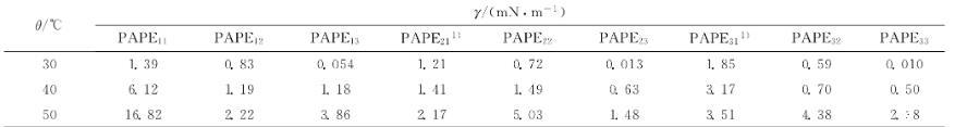 表2不同溫度下9種PAPEmn溶液-孤東二元驅原油體系的油-水界面張力的穩態值(γ)