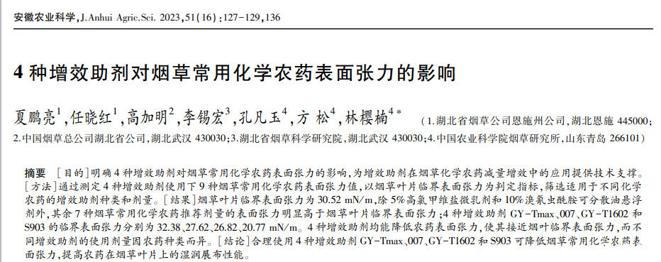 [結(jié)論]合理使用4種增效助劑GY-Tmax、007、GY-T1602和S903可降低煙草常用化學(xué)農(nóng)藥表面張力,提高農(nóng)藥在煙草葉片上的濕潤(rùn)展布性能。