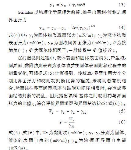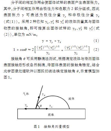 接觸角法屬于熱力學方法,以浸潤理論為基礎,當液體與固體填料表面接觸時達到浸潤平衡。YoungT以一種液體附著在另一種固體上作用力平衡為前提條件,提出了著名的楊氏方程