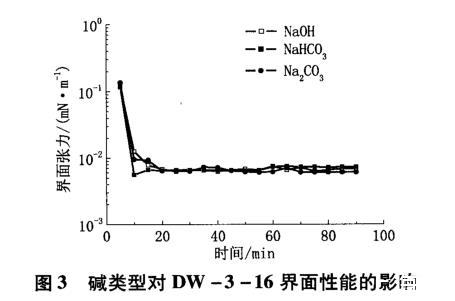 DW-3-16含量0.25%,堿量0.8%,考察各種堿NaOH、Na2CO3、NaHCO3對界面張力的影響,結果見圖3。在考察的堿類型中,均能使油水界面張力達超低界面張力(10-3mN/m),且由于堿的加入使達超低界面張力的時間縮短(20 min即可達到),強堿和弱堿對界面性能影響較小。