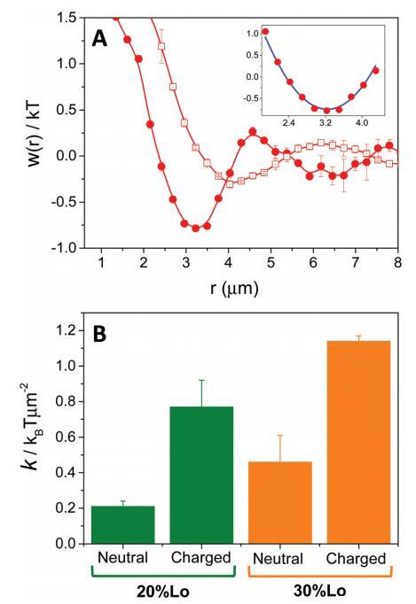 圖 4 (A) 域之間的平均力勢 w(r) 從 由帶電(圓圈)或 中性(正方形)域。 插圖:擬合實驗的例子 數據(藍色曲線)對應于 20%Lo 的帶電域。 (B) 春天 諧波電位常數,通過擬合 w(r) 的第一個谷值獲得 為中性和帶電雙層的二次函數(見 A 中的插圖) 以指定的液體順序百分比。