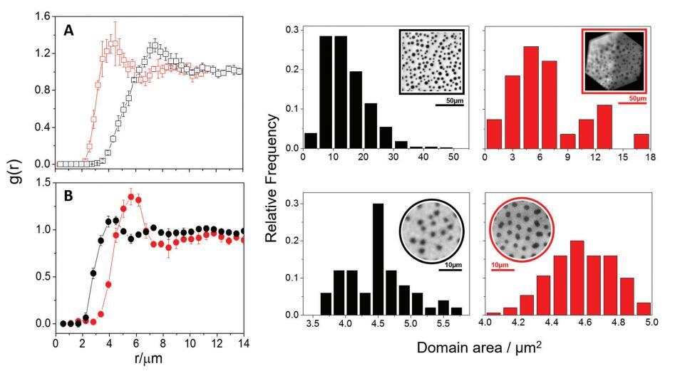 圖 3 中性 (A) 和帶電 (B) 域的徑向分布函數及其各自的域區域分布。 雙層顯示為紅色 和黑色的單層。 (A) 中的 %Lo 對應于 20–23%,而 (B) 中的 %Lo 對應于單層和雙層的 16–19%。 插圖:代表性熒光 脂質膜的圖像。
