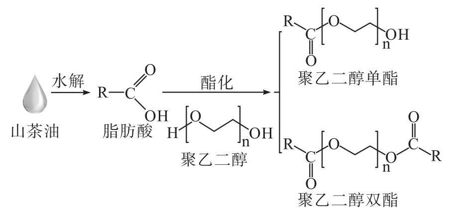 為了解決上述問題,本文以聚乙二醇600(PEG600)和山茶油水解產(chǎn)物為原料,通過水解-酯化兩步法制備改性山茶油,并對其各項性能指標進行評價,為山茶油在水劑型化妝品中的應(yīng)用提供數(shù)據(jù)支持。改性山茶油的制備原理如圖1所示。