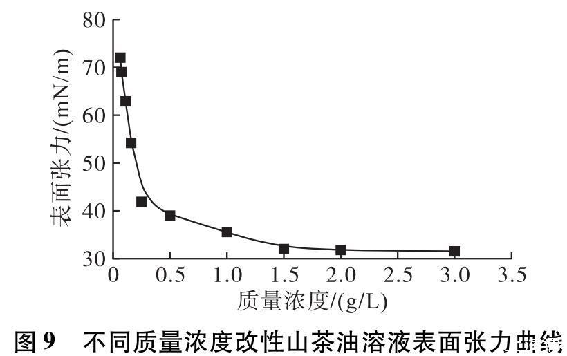 對不同質量濃度的改性山茶油溶液進行表面張力測試,結果如圖9所示。