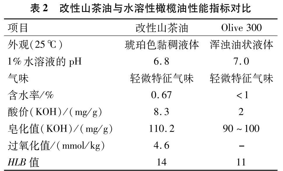 改性山茶油與水溶性橄欖油(Olive 300)的各項性能指標如表2所示。