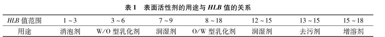 HLB值可用來衡量表面活性劑的親水親油性的大小,HLB值越大代表親水性越強,HLB值越小代表親油性越強,HLB值的轉折點為10,HLB值大于10一般為親水性,HLB值小于10為親油性,人們一般以HLB值為標準指導表面活性劑的實際應用(見表1)。