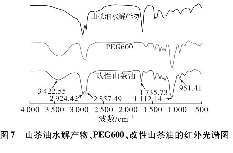 用50 mL的乙酸乙酯飽和食鹽水溶液分3次萃取產物,除去未完全反應的PEG600和山茶油水解產物,氮吹,干燥。對山茶油水解產物、PEG600和改性山茶油分別進行紅外性能表征,其紅外光譜圖如圖7所示。