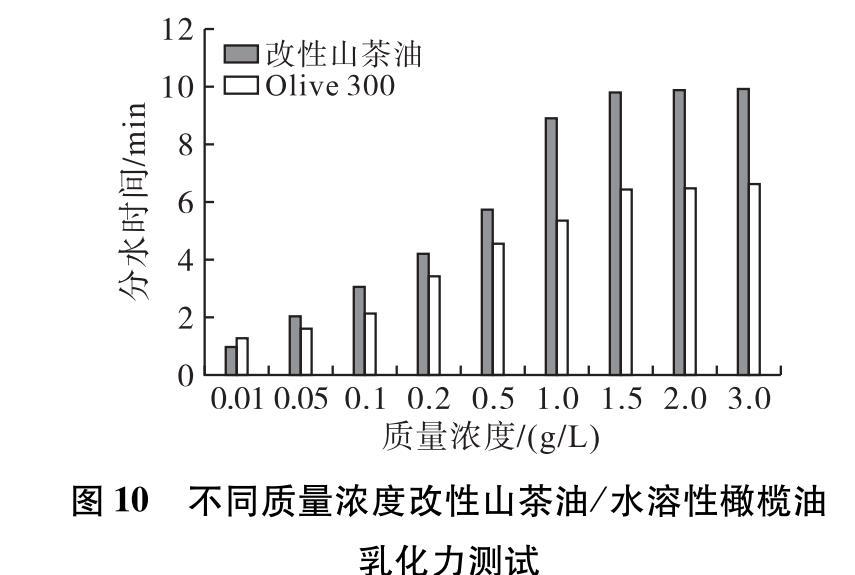 采用分水法對不同質量濃度的改性山茶油和水溶性橄欖油(Olive 300)進行乳化力測試,分水時間越長表明乳化性能越好,其結果如圖10所示。