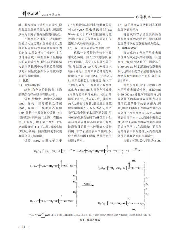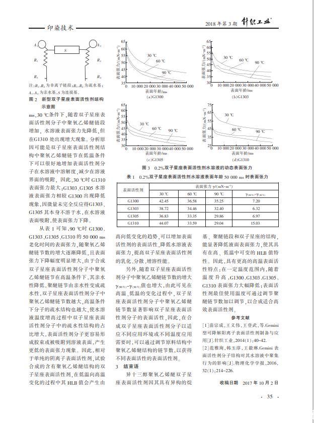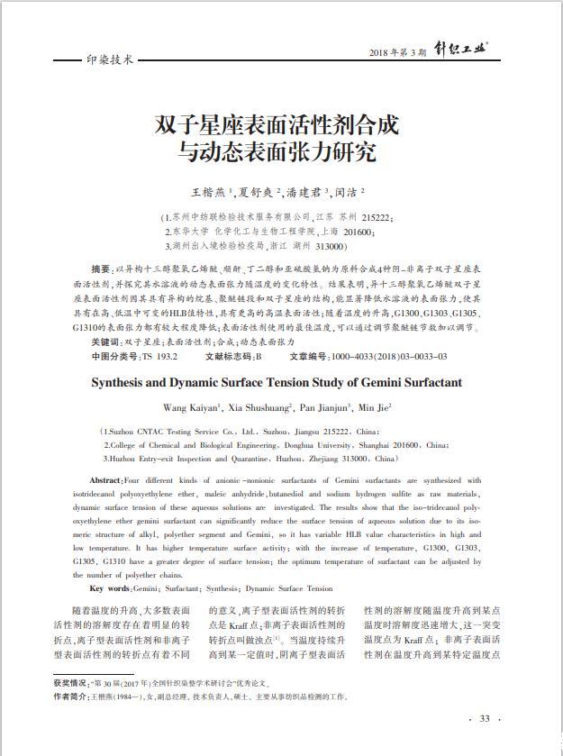 以異構十三醇聚氧乙烯醚、順酐、丁二醇和亞硫酸氫鈉為原料合成4種陰-非離子雙子星座表面活性劑,并探究其水溶液的動態表面張力隨溫度的變化特性。結果表明,異十三醇聚氧乙烯醚雙子星座表面活性劑因其具有異構的烷基、聚醚鏈段和雙子星座的結構,能顯著降低水溶液的表面張力,使其具有在高、低溫中可變的HLB值特性,具有更高的高溫表面活性;隨著溫度的升高,G1300、G1303、G1305、G1310的表面張力都有較大程度降低;表面活性劑使用的最佳溫度,可以通過調節聚醚鏈節數加以調節。