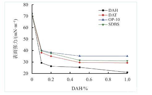圖3 DAH與常用防水鎖劑對(duì)蒸餾水表面張力的影響