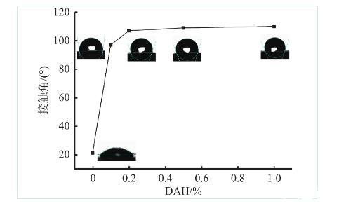 將巖心切片,使用800號(hào)金相砂紙將巖心片充分打磨,在室溫下將巖心片放入不同濃度的防水鎖劑DAH溶液,浸泡10 h,取出后在室溫下晾干,使用OCA-25型光學(xué)接觸角測(cè)定儀測(cè)定蒸餾水在巖心片表面的接觸角,結(jié)果見(jiàn)圖4。