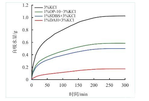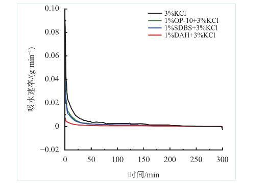 由圖5可以看出,水相會(huì)在毛細(xì)管力的作用下自吸入巖心,初始階段巖心的自吸水量較大,經(jīng)過(guò)200 min后達(dá)到平衡,自吸水量不再增加;加入DAH后,巖心自吸水量下降83.1%,且相較于常用防水鎖劑OP-10、SDBS效果更佳。圖6同樣表明,加入DAH后,巖心自吸水速率大幅降低,整個(gè)自吸過(guò)程中速率緩慢。上述實(shí)驗(yàn)表明,DAH可以減少因毛細(xì)管力被吸入地層的水相,從而降低水鎖損害發(fā)生的風(fēng)險(xiǎn)。