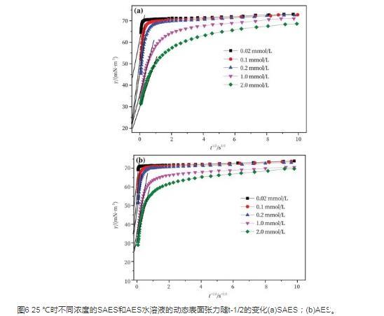 從圖4可以看出所測不同濃度不同表面活性劑的表面張力在初始階段均快速下降,一定時間后趨于平穩(wěn)狀態(tài)。這是因為動態(tài)表面張力測試過程中新形成的表面遠偏離于平衡態(tài),吸附層離子的濃度很低,體相與吸附層的濃度差大,因此動態(tài)表面張力變化很大。隨著吸附的進行,次表面濃度和表面濃度逐漸增大,擴散和吸附的速度均逐漸降低,動態(tài)表面張力隨著吸附時間的增加而降低的趨勢也逐漸變得平緩。當表面活性劑濃度增大時,表面張力的下降幅度和速度也隨之增大,而且相應地縮短了到達平衡狀態(tài)的時間。這種隨體系濃度的增加達到平衡所需的時間越短的趨勢與已經(jīng)報道的一些烷基表面活性劑的結果是相一致的。在相同濃度下,SAES表面張力下降的速率大于AES,這是由于SO4-在碳氫鏈中間的化合物比在端點者擴散速度快。