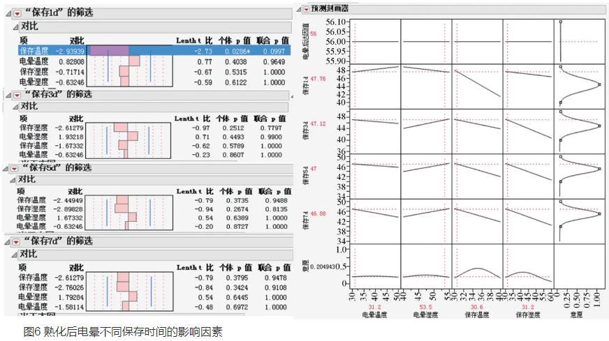 通過個體P值數據分析,保存溫度的影響最大,保存1 d影響因素從大到小依次為保存溫度、電暈溫度、保存濕度、電暈濕度;電暈溫度影響較小,可忽略。隨著保存時間的延長,保存濕度的影響逐漸增大。電暈溫度或濕度隨著保存時間的延長影響逐漸減小。因此整天分析影響因素為保存溫度>保存濕度>電暈濕度>電暈溫度。