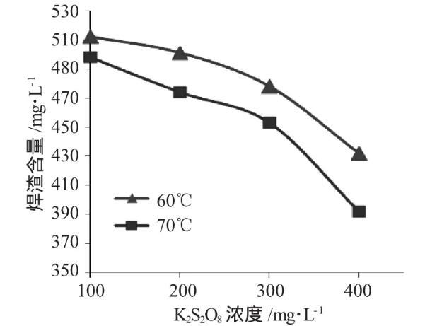 (3)K2S2O8破膠后的殘?jiān)暮侩S著K2S2O8濃度的增加,殘?jiān)恐饾u下降,溫度越高,殘?jiān)肯鄬?duì)降低越明顯,對(duì)地層損害越小。