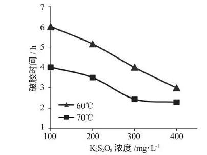 室內(nèi)實(shí)驗(yàn)溫度為60℃與70℃的對(duì)比,70℃時(shí)K2S2O8半衰期為495min比60℃的半衰期2310min分解速度更快,破膠時(shí)間更短,適用于現(xiàn)場(chǎng)壓裂作業(yè)。吳錦平得到結(jié)論50℃以下,過(guò)硫化物破膠能力減弱,不再適合做水基壓裂液的破膠劑。