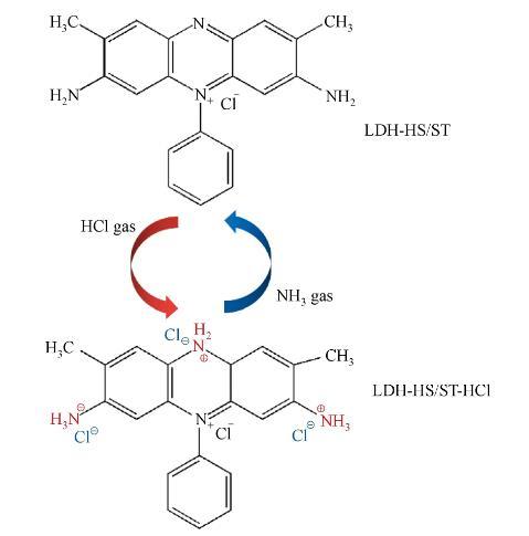 圖5 HCl和NH3氣體對LDH-HS/ST LB復合膜的化學反應機理