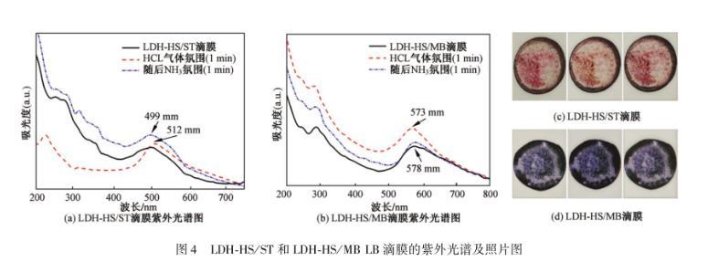 此外,為了進一步說明LDH-HS/染料復合LB膜的酸致變色敏感性,還制備了LDH-HS/染料混合滴膜作為對比,并進行了相關數據的表征。LDH-HS/染料混合滴膜的紫外可見數據如圖4所示。圖4(a)是LDH-HS/ST混合滴膜酸堿氛圍變化的紫外光譜,從數據中可以看出:滴膜被放在HCl氣體中1 min時間,最高峰位置從499 nm處向右移動到了512 nm處,盡管發生了一定的位移,但是移動范圍是比較微小的。再將該滴膜放置在NH3氛圍中1 min,特征峰又移動回原始位置。圖4(b)中顯示出LDH-HS/MB滴膜在HCl氛圍中一段時間后峰位置從578 nm藍移到573 nm,在NH3氛圍中峰位置幾乎回到了原位置,但是位移范圍也是相當小的。與此同時,觀察兩個滴膜基底片的顏色(圖4(c)和4(d)),發現它們在酸堿氛圍后的顏色變化不是很明顯。