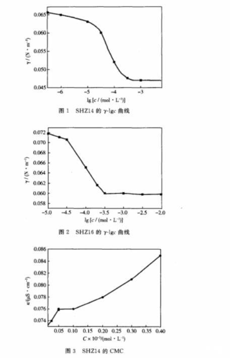b.SHZ16的臨界膠束濃度為比SHZ14要低,這是由于SHZ16的碳?xì)滏湵萐HZ14稍長(zhǎng),導(dǎo)致疏水基之間的相互干擾減少,造成在表面的自組織能力增強(qiáng),表面吸附能力有所升高,從而使臨界膠束濃度降低。