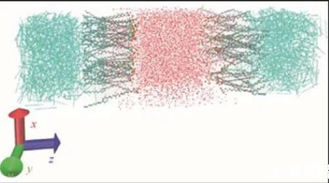在進行分子動力學模擬之前構建出合理的力場是極為重要的工作。本文通過Autom-ated Topology Builder(ATB)and repository生成的GROMOS系列力場參數(shù),利用現(xiàn)有的數(shù)據(jù)庫以及量子化學進行計算,同時它可以充分考慮到分子中的對稱結構,使其反映出的分子性質(zhì)及參數(shù)更為精確。但ATB只能處理原子數(shù)小于40的分子,對于分子數(shù)大于40的分子結構需進行拆分。在獲取準確的電荷及鍵參數(shù)之后利用packmol程序定向排列分子將其堆砌成立方體結構。此外,本文選取的油-水界面需使表面活性劑平均分布在水相兩側(cè),親水基靠近水相,疏水基靠向油相。圖2為初始狀態(tài)下體系截圖,其中中間紅色部分為水分子,左右兩側(cè)藍色部分為癸烷分子,油水中間即OPES分子。
